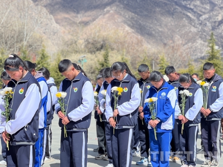 圖為拉薩那曲第一高級中學學生代表集體默哀 攝影:德吉卓瑪