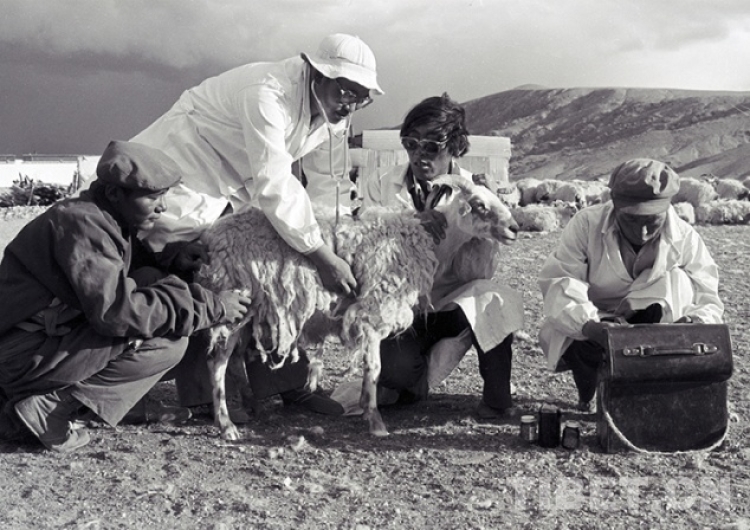 這是文部辦事處(現(xiàn)尼瑪縣)年輕的藏族獸醫(yī)在為羊群診治疾?。ㄌ普倜?/span>1988年攝)