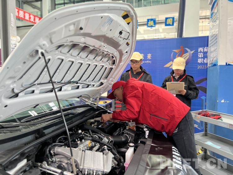 圖為參賽選手進行汽車維修項目比賽 攝影:德吉卓瑪