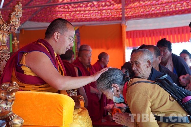 年逾七旬的洛桑巴姆得到班禪摸頂后倍感殊勝,激動地落下了眼淚。“能拜見活佛特別開心,得到活佛的摸頂賜福是我的福分?!甭迳0湍凡粩嗷仡^面向班禪躬身祈禱,久久不愿離去。