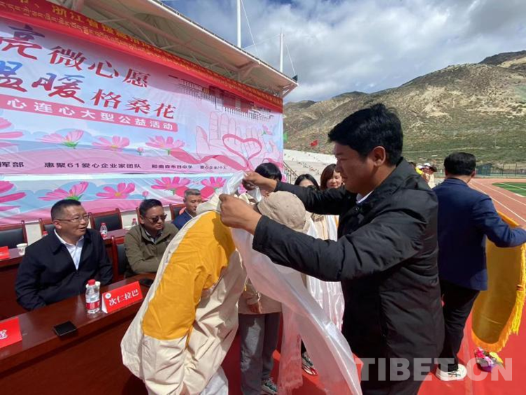 中國西藏網(wǎng)訊 6月19日,浙江金華市惠聚61愛心企業(yè)家團(tuán)隊萬里送愛心,在西藏森布日中學(xué)舉行“點(diǎn)亮微心愿·溫暖格?;ā惫婊顒印?/span>