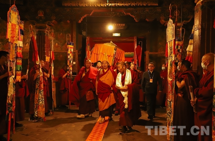 夜色中的古城拉薩靜謐祥和,千年古寺大昭寺燈火通明。凌晨5時許,大昭寺的僧人組成“色彰”隊,高舉經(jīng)旗、手持藏香,以藏傳佛教最高禮儀在通往大殿的兩側(cè)列隊恭迎班禪。
