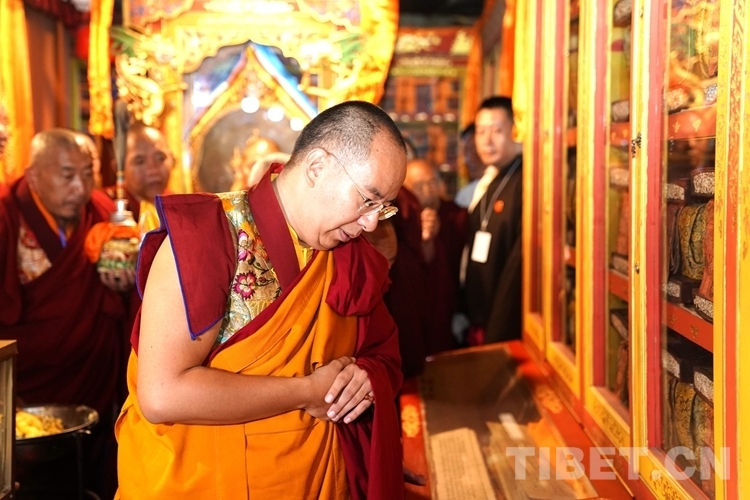上午9時,在僧眾的期盼中,班禪抵達(dá)哲蚌寺。頓時,鑼鼓喧天,法螺、法號齊鳴。在手持香爐的高僧以及吹嗩吶的僧人引路,手持黃傘的高僧護(hù)送下,班禪緩步走進(jìn)措欽大殿,逐一朝拜寺內(nèi)各殿堂,并向主供佛像敬獻(xiàn)哈達(dá)。期間,班禪還前往甘珠爾拉康參訪,這里藏有多部《甘珠爾》大藏經(jīng)。