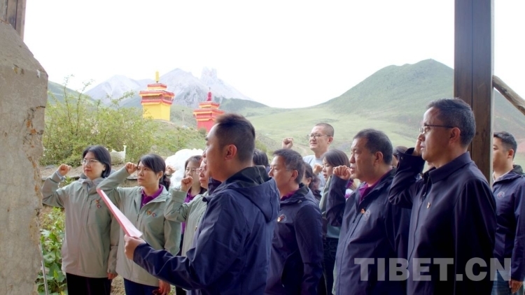 圖為“同心·共鑄中國(guó)心”昌都行第十一團(tuán)在洛隆縣重于泰山烈士紀(jì)念碑前重溫入黨誓詞,開展主題黨日活動(dòng)。(洛隆融媒提供)