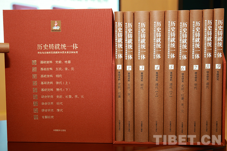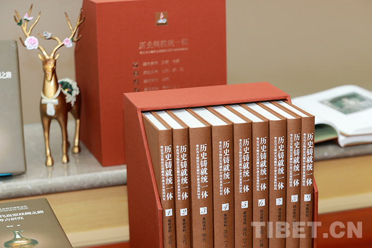 圖為發(fā)布會(huì)現(xiàn)場(chǎng)展覽的《歷史鑄就統(tǒng)一體:考古與文物所見(jiàn)西藏和中原關(guān)系資料研究》全套圖書(shū) 攝影:陳衛(wèi)國(guó)
