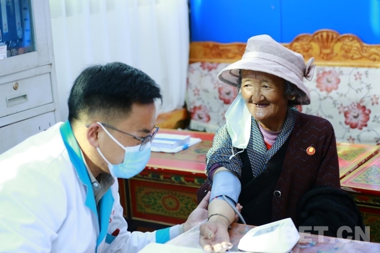 圖為亞?wèn)|縣中心醫(yī)院醫(yī)護(hù)人員為老人測(cè)量血壓 圖源:帕里鎮(zhèn)四社區(qū)工作隊(duì)