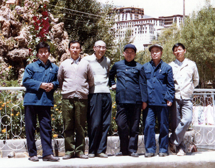 原國(guó)務(wù)院西藏經(jīng)濟(jì)工作咨詢組駐藏組范小建(右一)與本組人員趙清政、石萬(wàn)鵬、齊曉魯、府培生、冉令申(從左至右)在拉薩布達(dá)拉宮前合影留念(范小建提供,1984年6月攝)