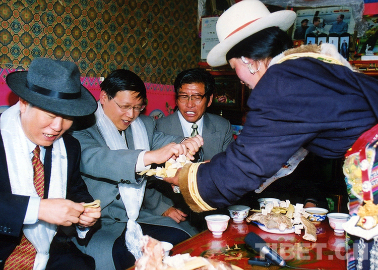 時(shí)任農(nóng)業(yè)部副部長(zhǎng)范小建(左二)在隨慶祝西藏自治區(qū)和平解放五十周年代表團(tuán)再次回到西藏時(shí),與代表團(tuán)其他成員一同在藏族群眾家中做客,了解生產(chǎn)和生活情況(范小建提供照片,2001年9月攝)