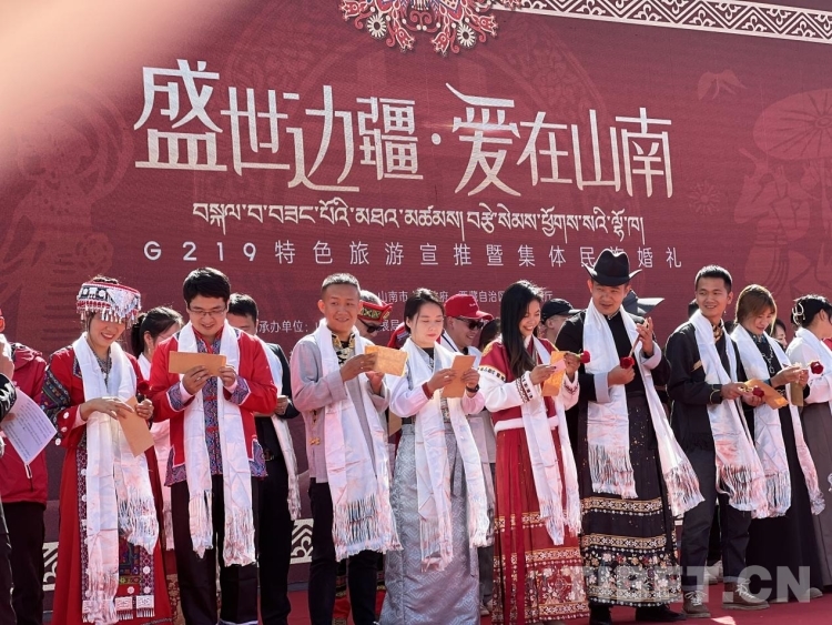 參加此次集體婚禮的新人中有來自北京、廣西、長沙、重慶等區(qū)外的游客,也有來自G219沿線縣(區(qū))的山南當(dāng)?shù)厍閭H,有漢族、藏族、彝族、苗族、回族等不同民族通婚的情侶、夫妻,他們年紀(jì)有別、身份不同、職業(yè)各異,卻都選擇來到山南奔赴這場浪漫之旅。在接下來的六天,他們將陸續(xù)前往山南市加查縣、隆子縣、措美縣、洛扎縣及浪卡子縣,在欣賞大美邊疆風(fēng)光、領(lǐng)略特色民族風(fēng)情的同時,感受中華民族一家親的團結(jié)精神。