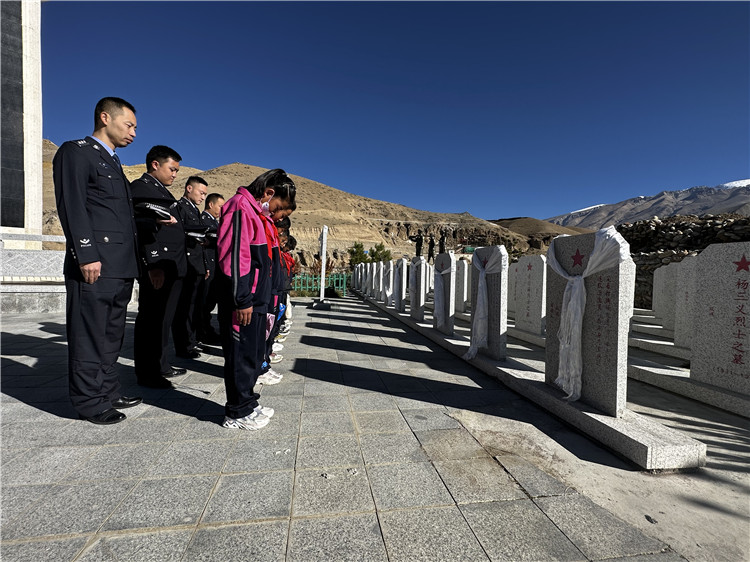 圖為參加活動(dòng)的民警與學(xué)生在普蘭縣烈士陵園向英雄先烈鞠躬默哀
