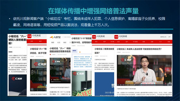“全國網(wǎng)絡(luò)普法行?四川站”活動啟動儀式上,四川省公安廳、成都市檢察院、四川省未成年人網(wǎng)絡(luò)保護促進會等單位代表進行了網(wǎng)絡(luò)普法經(jīng)驗分享,通過交流、學(xué)習(xí)推動網(wǎng)絡(luò)普法工作開展。