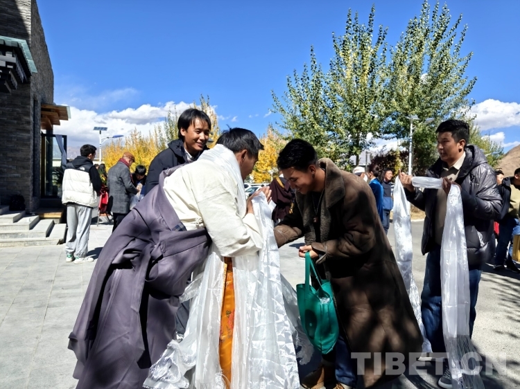 圖為學(xué)生們向丹巴繞旦之子、西藏丹巴繞旦唐卡藝術(shù)學(xué)校校長旦增平措敬獻(xiàn)哈達(dá),表達(dá)對丹巴繞旦教授的敬意