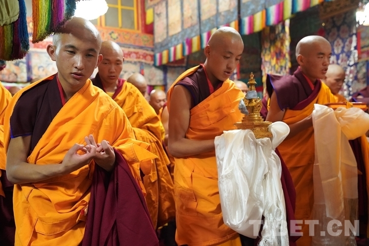 當天清晨,扎什倫布寺桑煙繚繞、法號聲聲,28 位受戒的年輕僧人帶著新制袈裟,迎著朝霞依次走向拉讓殿等待班禪授戒這一神圣時刻的到來。8時許,在手持黃傘、香爐和吹嗩吶的高僧護送引領下班禪緩緩步入拉讓殿,并與在場僧眾集體誦經。誦經儀式結束后,班禪就坐于拉讓殿寶座,4名高僧大德作為授戒眾,開始為僧人閉門授戒、剃度、賜法名、摸頂。此時,受戒僧人一一入座,兩手在胸前交叉,聽班禪引證經典告誡,并宣誓嚴守戒律。