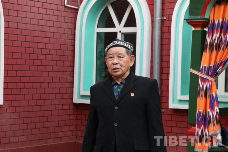 圖為沙勒克江·依明老人在自家小院舉行升旗儀式 攝影:王妍丹