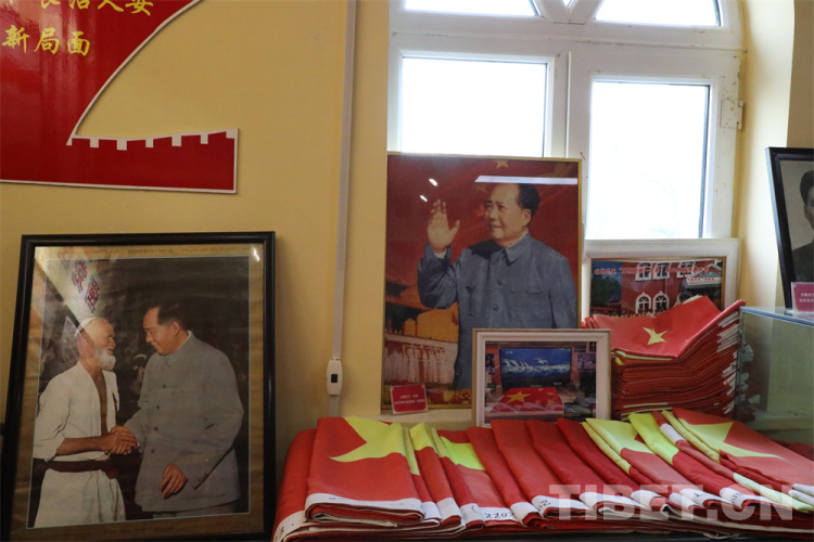 圖為小院二樓展覽廳室里擺放的國旗和毛主席的繡像與掛像 攝影:王妍丹