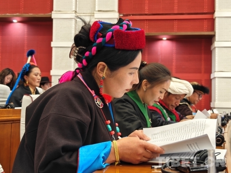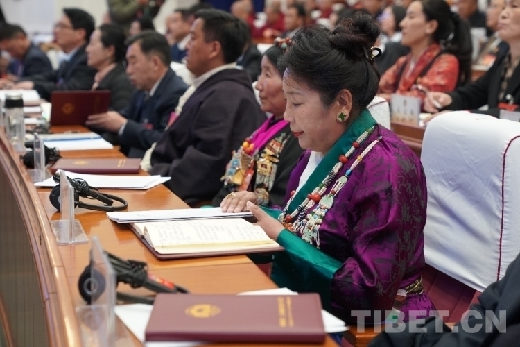 圖為開幕會(huì)現(xiàn)場委員在認(rèn)真審閱藏文版會(huì)議資料 攝影:次旦拉姆
