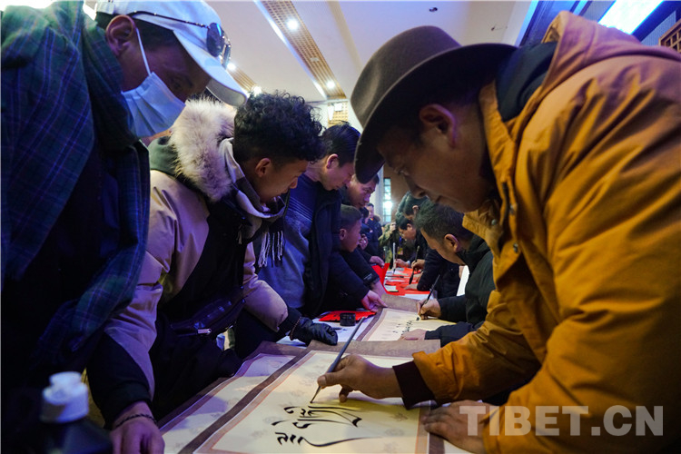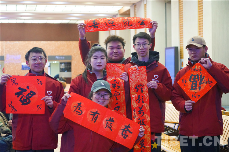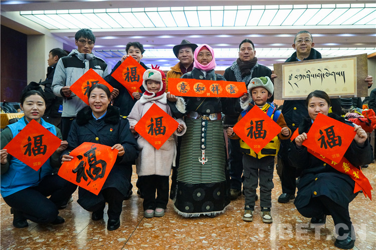 圖為春運(yùn)首日拉薩站向旅客免費贈送漢藏春聯(lián)及書法作品 攝影:趙振宇