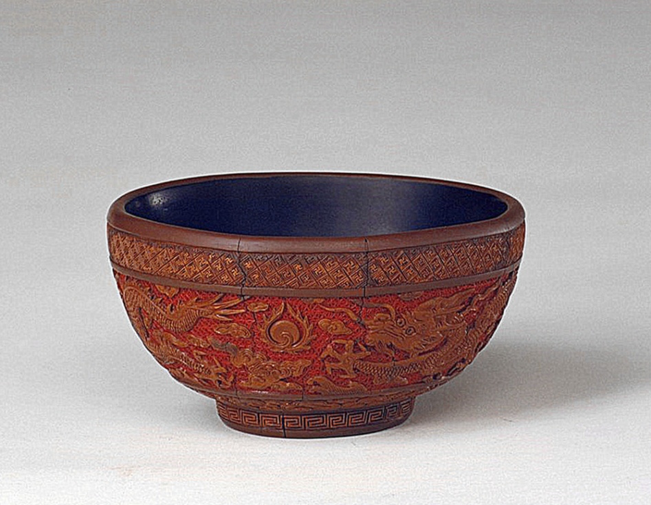 此剔黃云龍紋碗,高6.9厘米,口徑13厘米。碗圓口,內(nèi)髹黑漆,直壁下斂接圈足??谕庋丶案瓜虏拷闾庽埸S漆,雕“卍”字錦、如意云頭紋各一周。腹部以朱漆刻花錦為地,兩條黃色行龍追逐滾動的火珠,雙目圓瞪,活力四射,氣韻生動。碗足內(nèi)有刀刻填金“大明萬歷己丑年制”楷書款,該漆器的龍紋形象以及細謹?shù)募y飾為萬歷時期雕漆的典型風格。(中國西藏網(wǎng) 綜合/周晶)