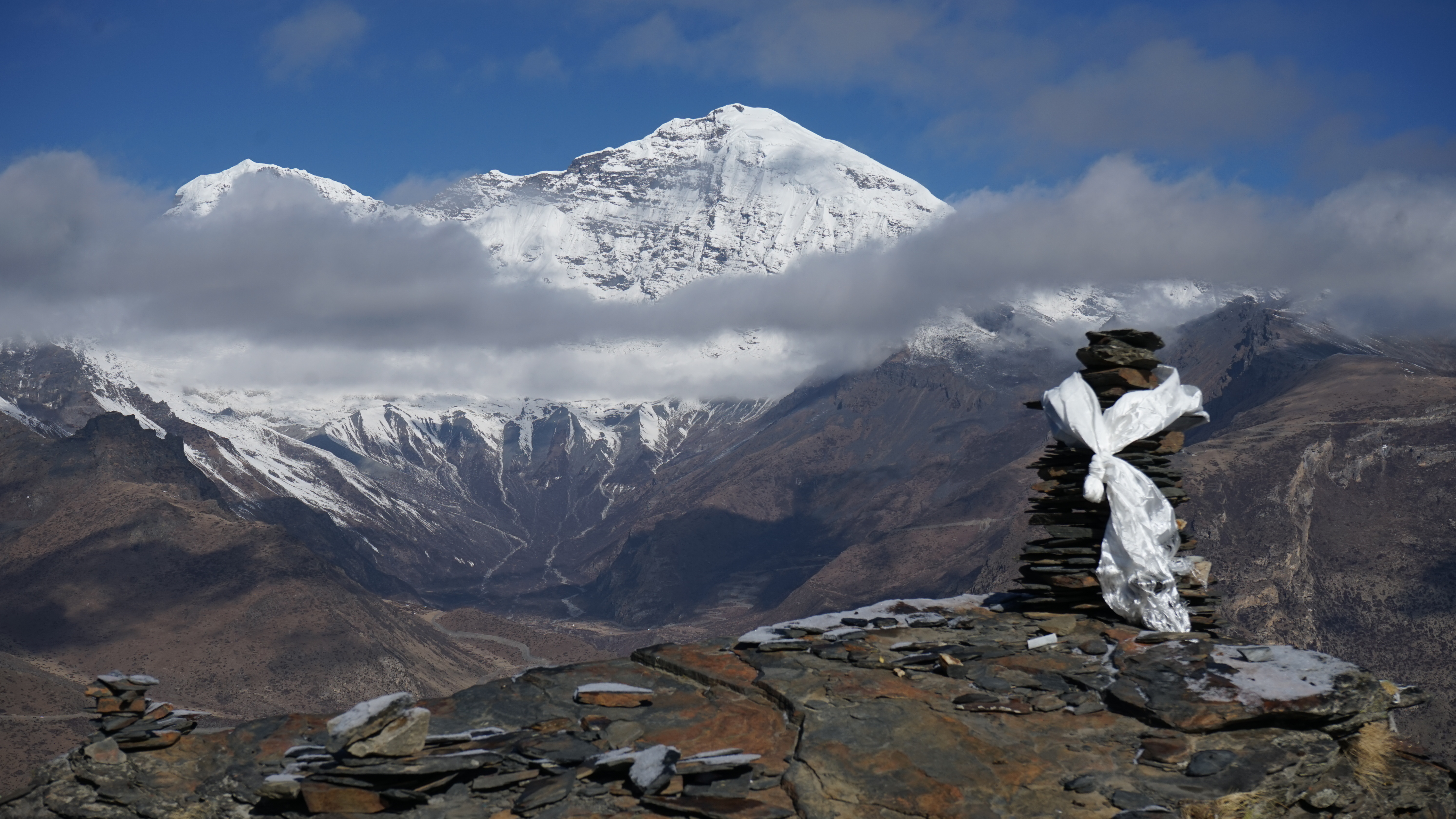 路上雪還在下,山里霧蒙蒙,能見度極低。到了波拉山頂,視野終于開闊了起來,能看到遠(yuǎn)處漫山的經(jīng)幡。翻過這座山,天色又開始忽明忽暗,似乎云本身就在那里,是我們不停從這片云進(jìn)去,從那片云出來。但總歸沒那么霧茫茫了。