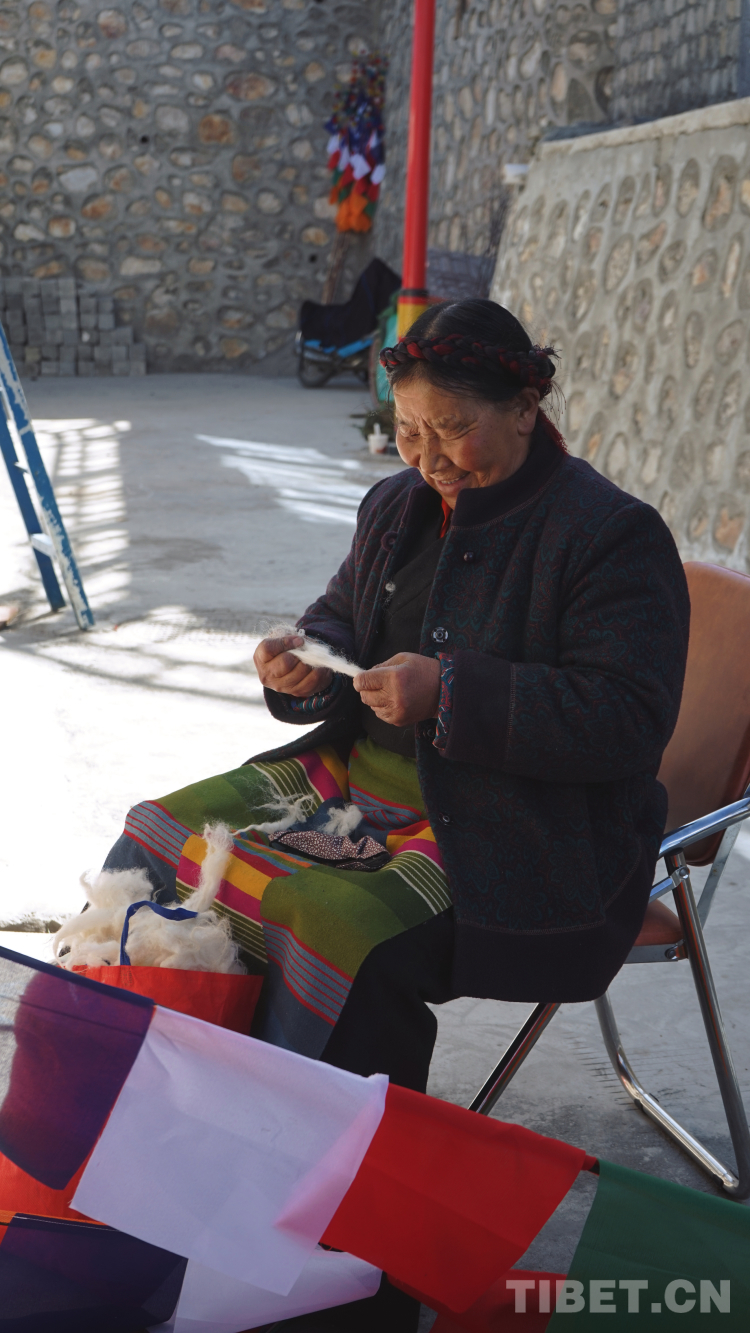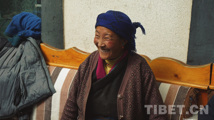 這是我最喜歡的莫啦。住在莫啦家的幾天里,除去采訪、收集素材和寫稿,最放松的時(shí)刻就是忙里偷閑和莫啦在廚房烤火、在巷子口曬太陽(yáng)。莫啦會(huì)問我穿得這么少冷不冷,會(huì)給我講路過的小女孩有個(gè)雙胞胎姐姐,會(huì)讓我送熱水給我的同事喝,會(huì)拿盛滿卡塞和奶渣的點(diǎn)心盒塞給我吃,會(huì)在我想把手頭工作做完再吃飯時(shí)問同事我怎么不吃飯。當(dāng)然這些我大多是聽不懂的,有些是德瓊阿佳(莫啦的女兒,拉康社區(qū)婦女主任,同時(shí)也是客棧的老板)和達(dá)次哥(這次出差的司機(jī)師傅)翻譯給我的,有些是我倆通過比劃猜到的。