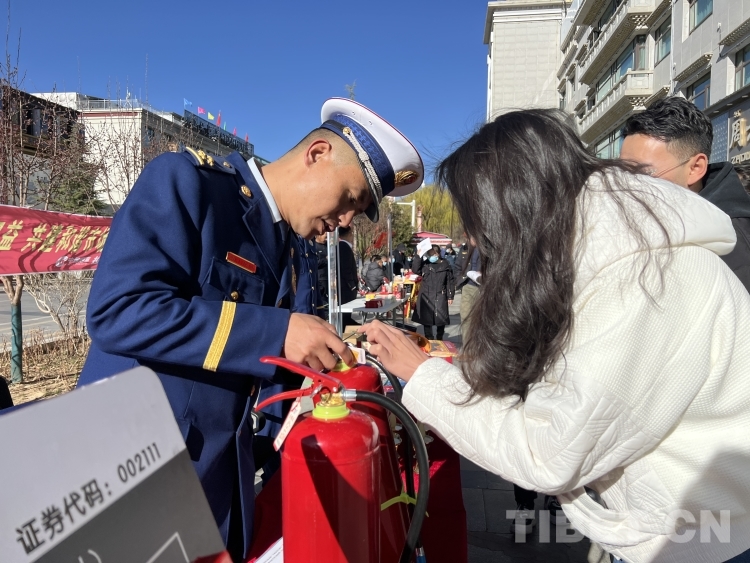 圖為活動現(xiàn)場拉薩市消防支隊工作人員向來往市民講解如何使用滅火器 攝影:德吉卓瑪