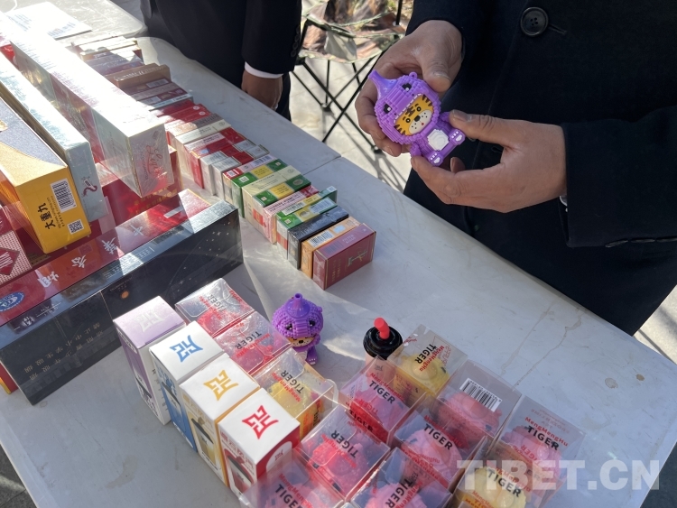 圖為西藏自治區(qū)煙草專賣局工作人員向來往群眾展示違規(guī)電子煙 攝影:德吉卓瑪