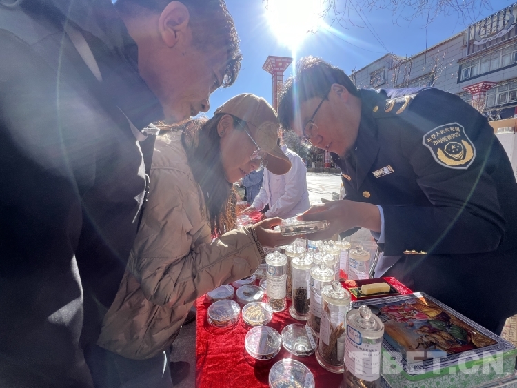 圖為市場監(jiān)管局工作人員向尼尼講解真假蟲草辨別方法 攝影:德吉卓瑪
