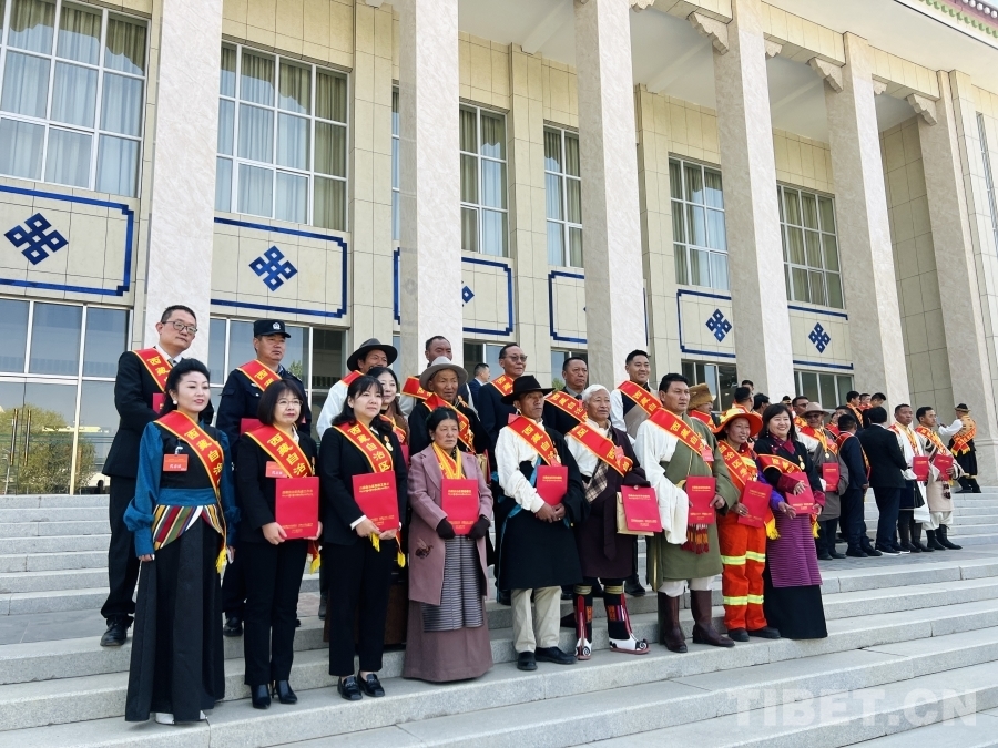 圖為表彰大會(huì)結(jié)束后獲獎(jiǎng)?wù)邆兒嫌傲裟?nbsp; 攝影:德吉卓瑪