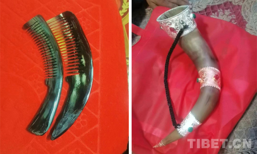 圖為麻木卓瑪管理站站長洛達(dá)用牦牛角制作的梳子和酒器 (洛達(dá)供圖)