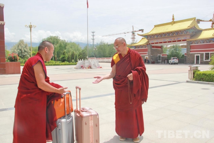 圖為青海省藏語(yǔ)系佛學(xué)院教務(wù)處副處長(zhǎng)、特級(jí)經(jīng)師悟嘉倉(cāng)(右一)與準(zhǔn)備離校的畢業(yè)學(xué)僧交談 攝影:劉莉