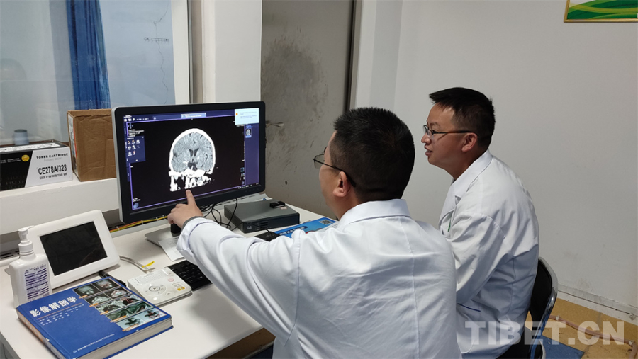圖為醫(yī)療隊隊員對腦?;颊叩娘B腦CT進行閱片