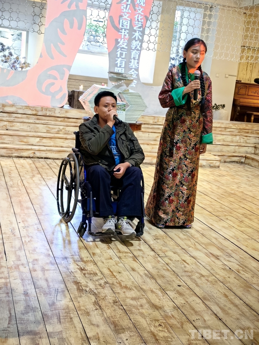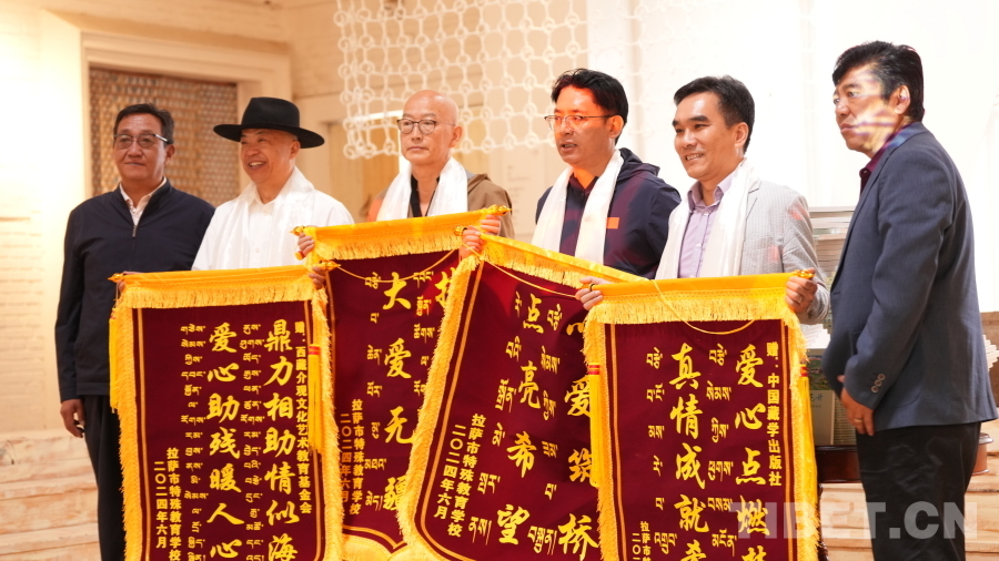 活動(dòng)現(xiàn)場(chǎng),拉薩市特殊教育學(xué)校師生向西藏社會(huì)主義學(xué)院羅旦博士、中國(guó)藏學(xué)出版社代表、北京大方弘文圖書(shū)發(fā)行有限公司代表、西藏介觀文化藝術(shù)教育基金會(huì)代表敬獻(xiàn)了哈達(dá),贈(zèng)送了錦旗、畫(huà)作,對(duì)他們?cè)谛聲?shū)出版中給予的支持和幫助表達(dá)了誠(chéng)摯的謝意。隨后,拉薩市特殊教育學(xué)校學(xué)生為現(xiàn)場(chǎng)來(lái)賓表演了二重唱《愛(ài)在陽(yáng)光下》、詩(shī)歌朗誦《光明》、舞蹈《舞動(dòng)大地》等精彩的節(jié)目,將活動(dòng)推向高潮,現(xiàn)場(chǎng)觀眾紛紛鼓掌叫好,氣氛十分感人。