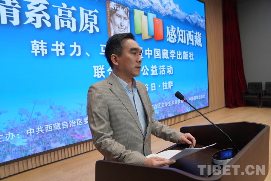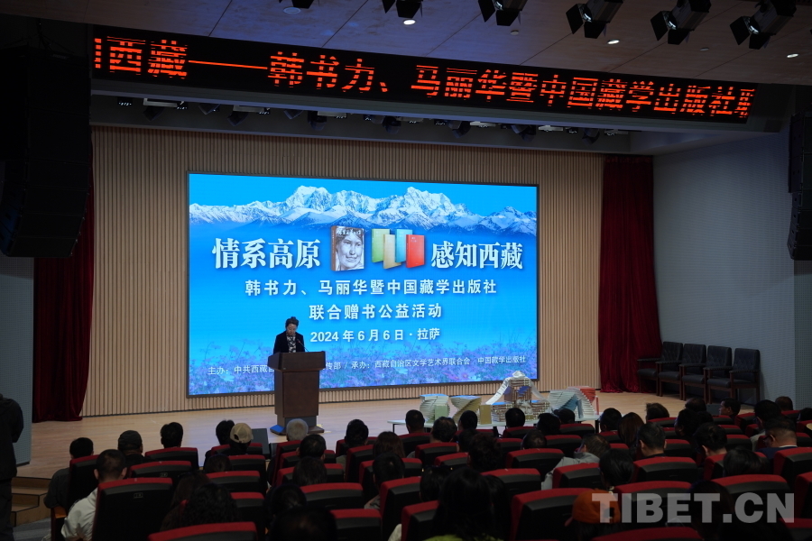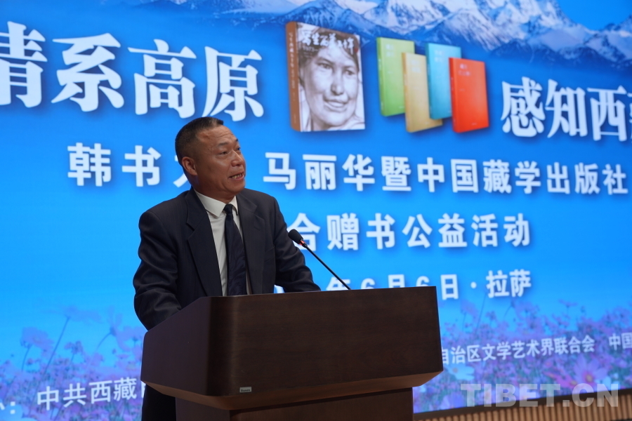 中國西藏網(wǎng)訊 6月6日上午,由西藏自治區(qū)黨委宣傳部主辦,自治區(qū)文聯(lián)、中國藏學(xué)出版社承辦的“情系高原 感知西藏——韓書力、馬麗華暨中國藏學(xué)出版社聯(lián)合贈(zèng)書公益活動(dòng)”在西藏美術(shù)館學(xué)術(shù)報(bào)告廳舉辦。自治區(qū)黨委宣傳部副部長何瑞,中國藏學(xué)出版社社長洪濤,自治區(qū)文聯(lián)黨組成員、副主席陳人杰,自治區(qū)黨委原常委、自治區(qū)政協(xié)原副主席德吉措姆,自治區(qū)文聯(lián)原主席、西藏美術(shù)家協(xié)會(huì)原主席韓書力,中國藏學(xué)出版社原總編輯、自治區(qū)文聯(lián)原副主席、西藏作家協(xié)會(huì)原副主席馬麗華等參加活動(dòng)。