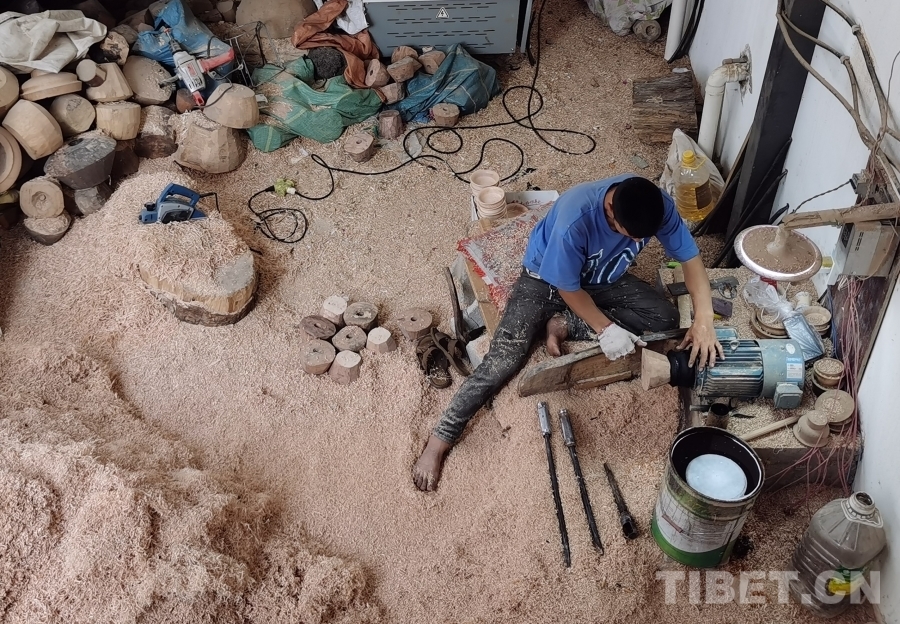 我們首先來到的是四川省非物質文化遺產(chǎn)項目——藏族民間車模技藝體驗基地?;匾粚邮枪ぷ鲄^(qū),一位師傅正在全身心制作木質生活用具,絲毫沒有察覺我們的到來。于是沒有過多打擾,我們徑直來到二樓展品陳列區(qū)。藏族民間車模技藝傳承人格絨次仁的兒子洛絨次仁拿起一個木碗,臉上露出樸實而靦腆的微笑介紹道,“這些都是選用樹瘤制作而成,一般選用鵝掌木、杜鵑等15類樹木,因為直木容易裂開。為了用具不裂開,處理后的樹瘤煮水后需晾干五至六個月,一個木碗制作工序可能要長達半年才能完成。此項技藝在家族傳承至今已有四代,我們要做就做好一點?!甭褰q次仁大哥希望更多人能了解這項非物質文化遺產(chǎn),有更多人愿意來傳承學習這份技藝,有更多人喜歡他們制作的這些木質生活用具。