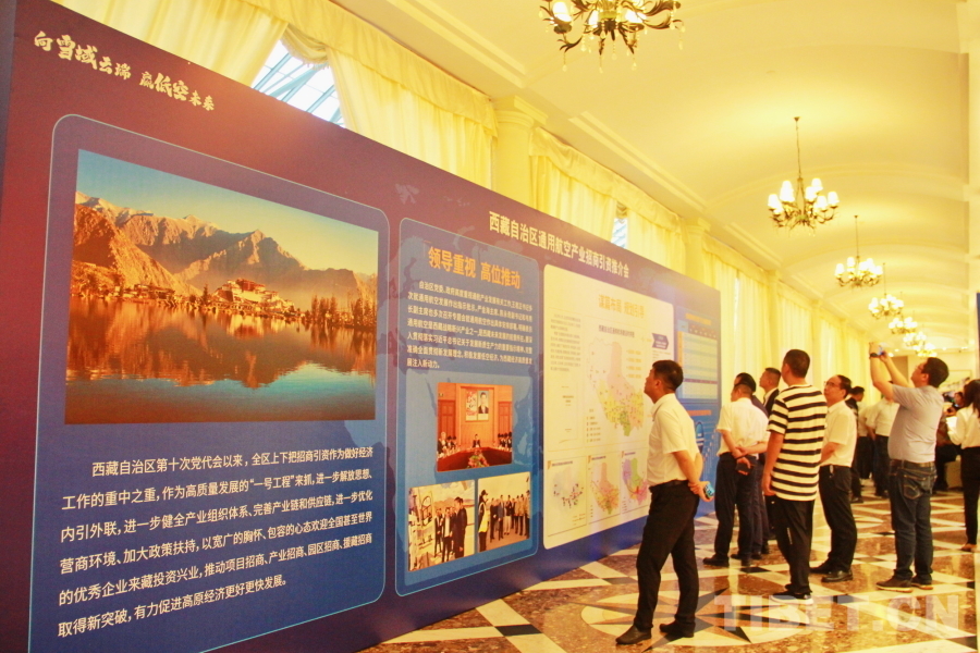 圖為西藏自治區(qū)通用航空產(chǎn)業(yè)招商引資推介會(huì)現(xiàn)場(chǎng)設(shè)置的展板吸引與會(huì)嘉賓駐足了解 攝影:劉莉