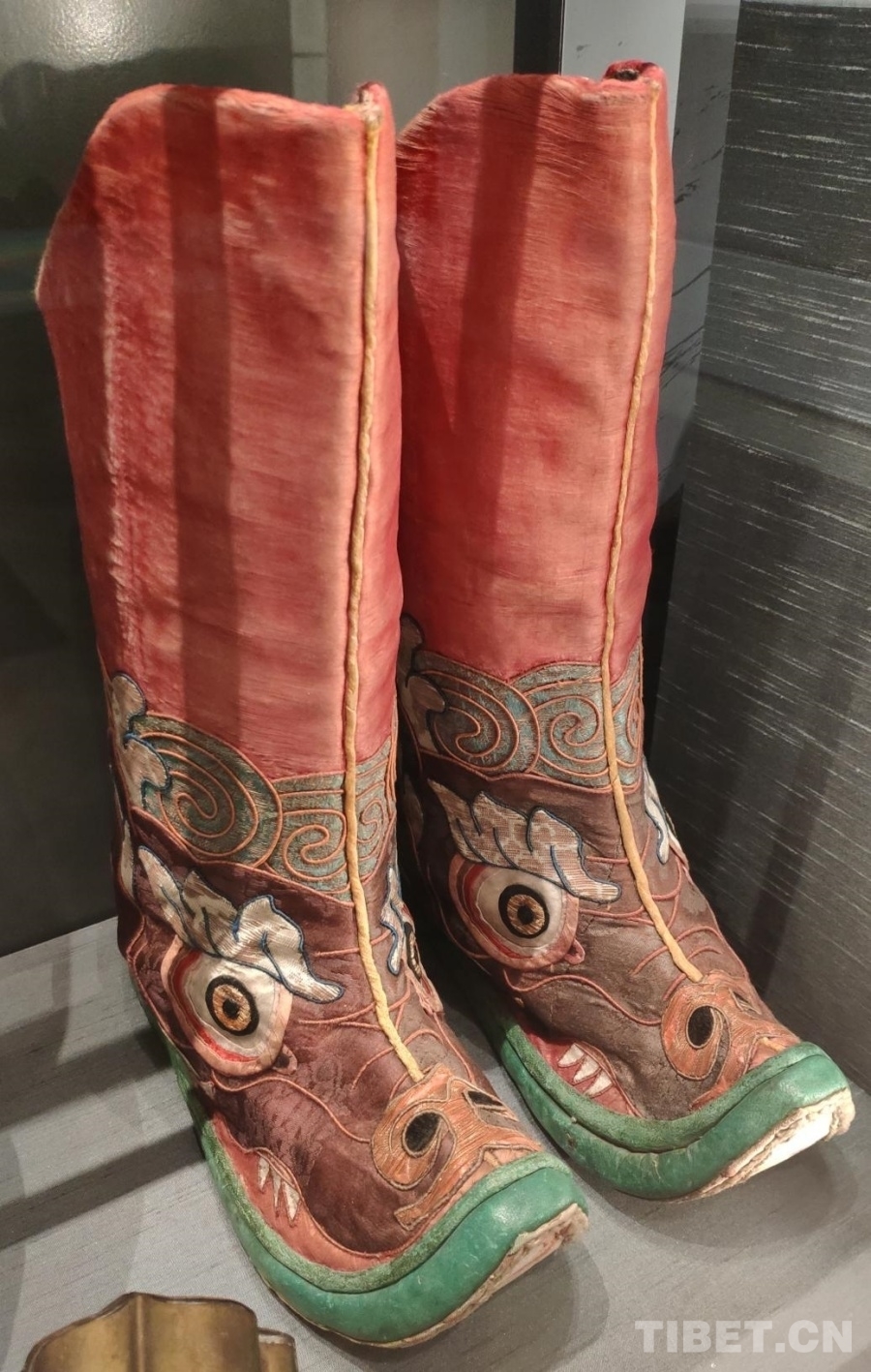 15號藏品為龍首紋藏靴,出自西藏,進(jìn)入館藏時間為1905年。據(jù)博物館介紹,這雙靴子不是一般藏族百姓穿的靴子,而是降神者在降神儀式上所穿用的。這雙靴子除了具有一般藏靴的特征外,鞋面繡有龍首,代表神圣之意。靴型寬大,前頭略尖,且向上翹起,造型別有韻致。