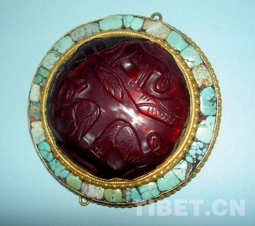 大英博物館藏19世紀(jì)圓形銅鎏金鑲紅玻璃綠松石飾品(16號)