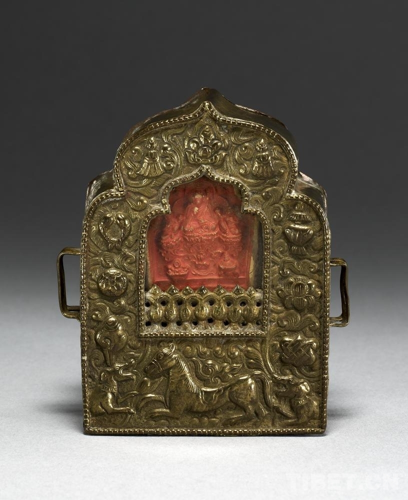 19號藏品為銅制“嘎烏”,內(nèi)裝有“擦擦”和香料包,出自西藏,進(jìn)入館藏時間為1905年。“嘎烏”,是藏語的音譯,指護(hù)身佛的盒子,即小型佛龕。盒子里一般裝有“擦擦”佛像、印著經(jīng)文的綢片、舍利子或者甘露丸、由高僧念過經(jīng)的藥丸,以及活佛的頭發(fā)、衣服的碎片等?!案聻酢边€是精美的裝飾品。其形狀不一,一般為銀質(zhì)或銅質(zhì),盒面上鑲嵌有瑪瑙、綠松石,雕刻有多種花紋圖案。