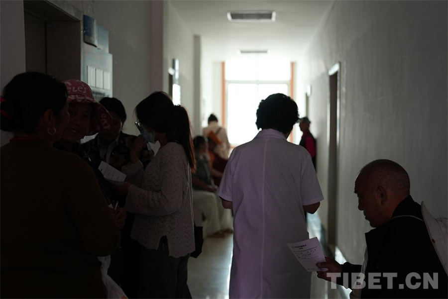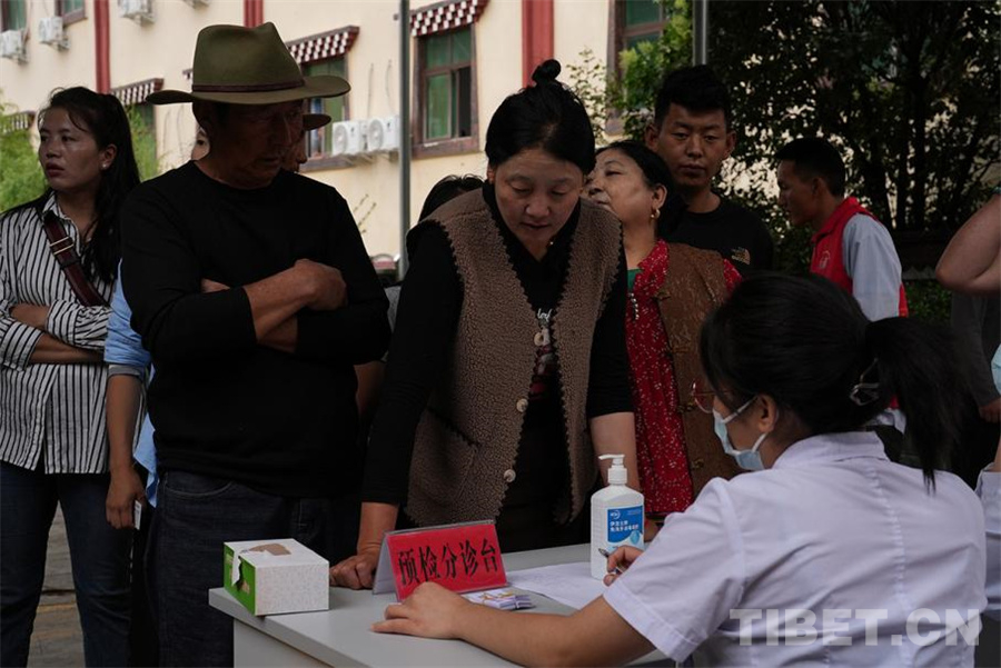 圖為巴塘縣群眾在預(yù)檢分診臺排隊(duì)領(lǐng)取病科條 攝影:姚浩然