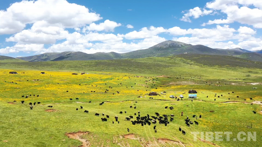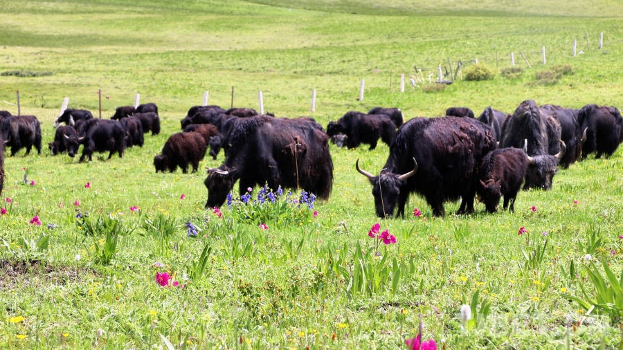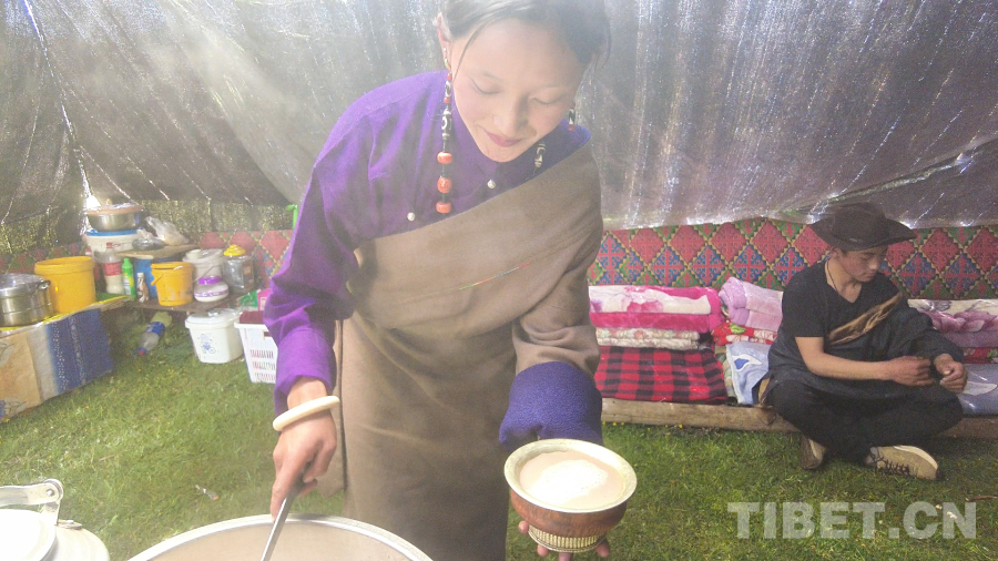 早晨天剛蒙蒙亮,他們就準備出發(fā)了,一家人把生活必需品黑帳篷,火爐,鍋碗瓢盆,被褥及酥油糌粑等物資打包裝車,由家人先駕駛拖拉機把所有物資運送到夏季遠牧點,四郎彭措則和他的侄兒騎馬趕牛出發(fā)。冬季牧場到夏季牧場距離60公里,他們經(jīng)過9個小時的遷徙,終于在下午3點到達夏季牧場。此時他的家人也在鄰居的幫助下搭好了帳篷,煮好了酥油茶等待著他們。到了夏季牧場,牦牛們也迫不及待奔向了肥美的水草,四郎彭措和他的侄兒也終于可以卸下滿身的疲憊,品嘗家人們準備好的美食。夏季牧場正是一年當中最美的季節(jié),草原上開滿了五顏六色的花朵,多日不見的好友也帶著自己的家人早一步駐扎在此地,四郎彭措說道:“夏季放牧,轉(zhuǎn)場雖然辛苦,但也是一年中難得的閑暇時光。夏季水草肥美,牦牛們有充足的食物,來到夏季牧場放牧的牧民也有更多的活動時間,賽馬、唱歌、跳鍋莊舞是我最喜歡的活動?!?/p>