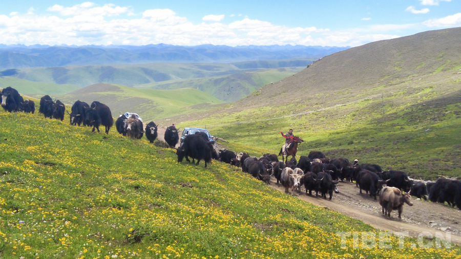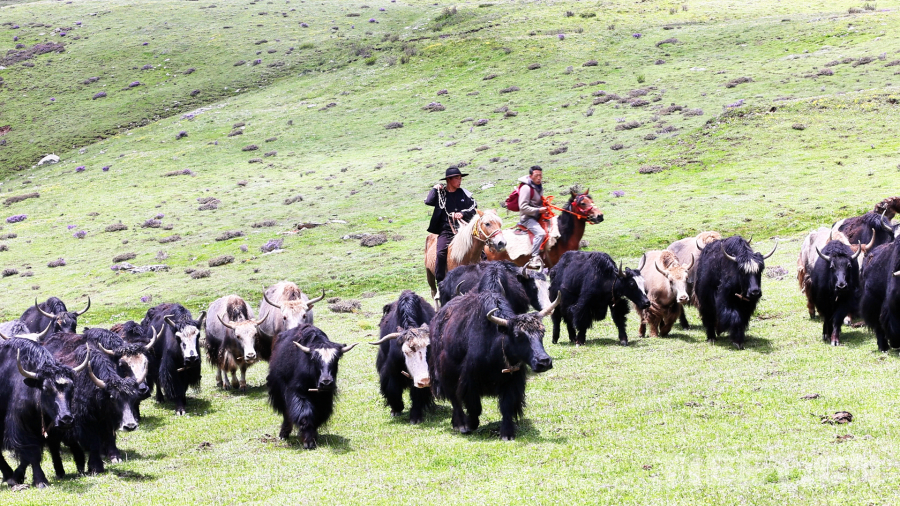 昌臺草原的7月,進入夏季,白玉縣阿察鎮(zhèn)阿察村的牧民們便開始轉(zhuǎn)移牧場,從冬季牧場日通草原轉(zhuǎn)移到夏季牧場石門科草原,每一次轉(zhuǎn)場都是一次大遷徙,氣勢磅礴壯觀。四郎彭措一家也開始了今年的轉(zhuǎn)場工作,沿著冬季牧場到夏季牧場的牧道,四郎彭措和表弟仁真巴登兩位牧人騎著兩匹駿馬,趕著一群牦牛有序地進行著轉(zhuǎn)場。