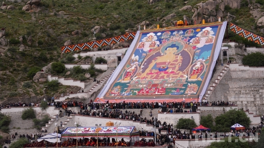 中國西藏網(wǎng)訊 8月4日,哲蚌寺背后的半山腰上,伴著莊嚴(yán)的法號(hào)聲,巨幅釋迦牟尼像唐卡緩緩展開,吸引著數(shù)以千計(jì)的信教群眾和來自世界各地的游客,場(chǎng)面蔚為壯觀。