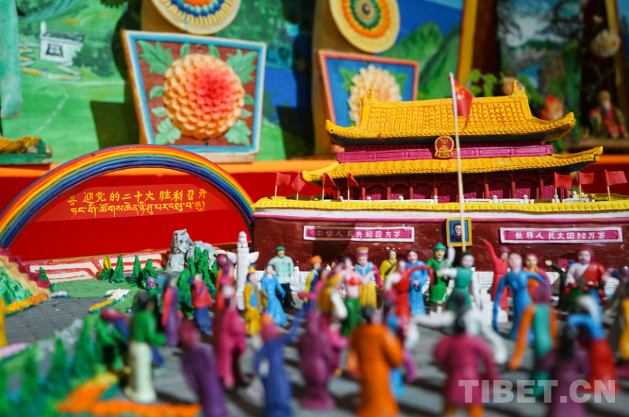 阿旺西尼學習酥油花制作已有6年多的時間,近年來他與寺院僧尼圍繞愛黨愛國、民族團結(jié)、鄉(xiāng)村振興等主題創(chuàng)作了大量作品。