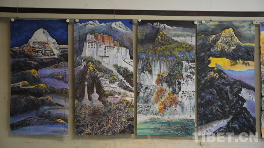圖為尼瑪澤仁即將帶往法國(guó)的四幅展覽畫作,從左到右分別是《喜馬拉雅的金字塔岡底斯神山》《天上的西藏布達(dá)拉宮》《九寨水韻》《攀越珠峰》 攝影:陳浩力