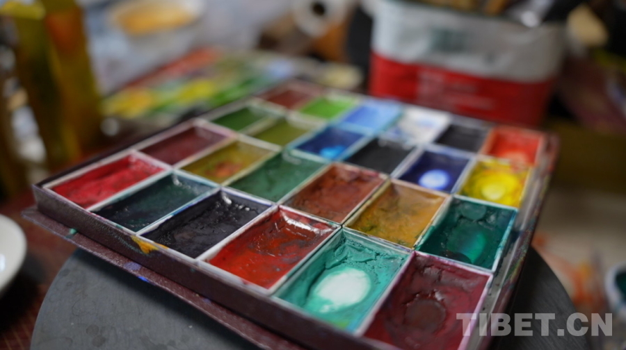 圖為尼瑪澤仁繪畫時(shí)使用的顏料盤 攝影:陳浩力