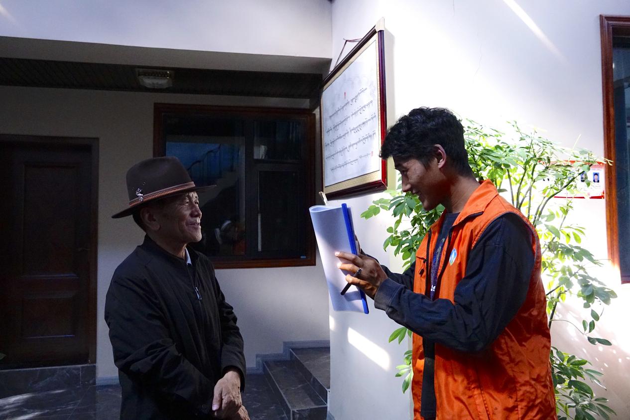 圖為專職網(wǎng)格員拉巴頓珠正在入戶調(diào)研以更新平臺信息。 攝影:邊子捷