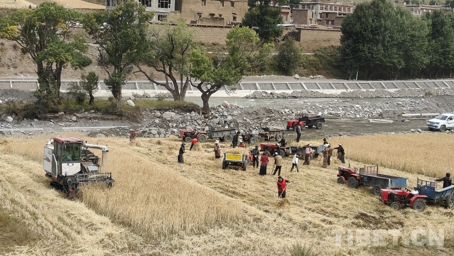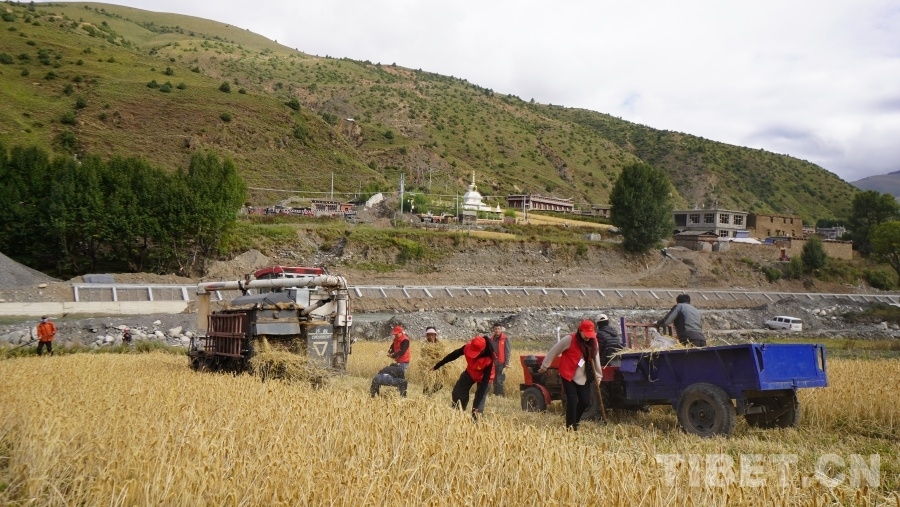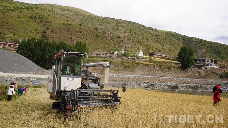中國西藏網(wǎng)訊 眼下正是地處川西高原的四川省甘孜藏族自治州理塘縣青稞成熟時節(jié),群眾們忙著用收割機(jī)收獲青稞,在中秋時節(jié)感受豐收的喜悅。