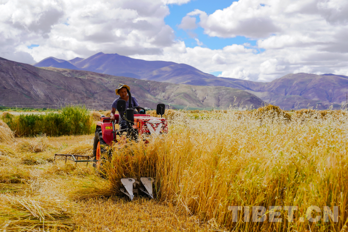 飄香的秋日一片金黃,一臺臺收割機正在青稞田里往來穿梭。2023年,西藏青稞產量達84.36萬噸,播種面積達222.87萬畝,累計建成高標準農田430萬畝,青稞良種覆蓋率達到93%,主要糧食作物耕種收綜合機械化率達到71%以上。