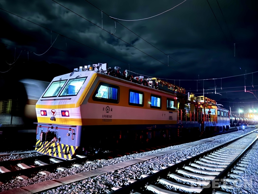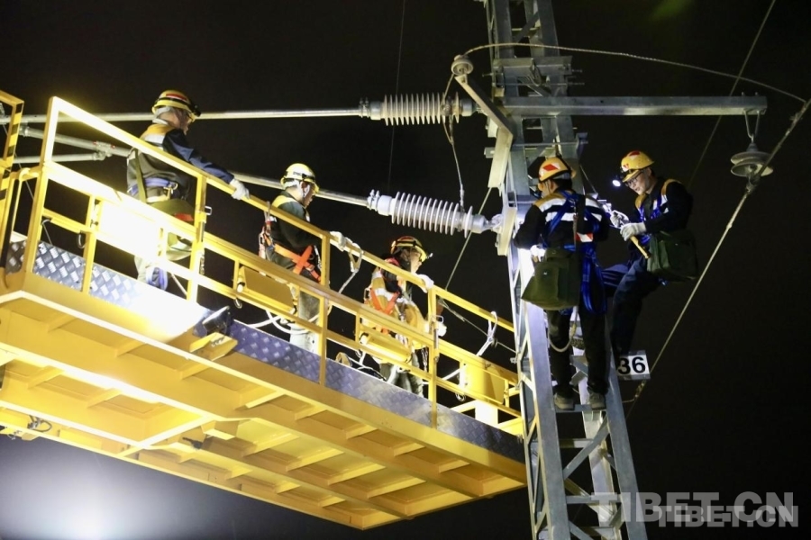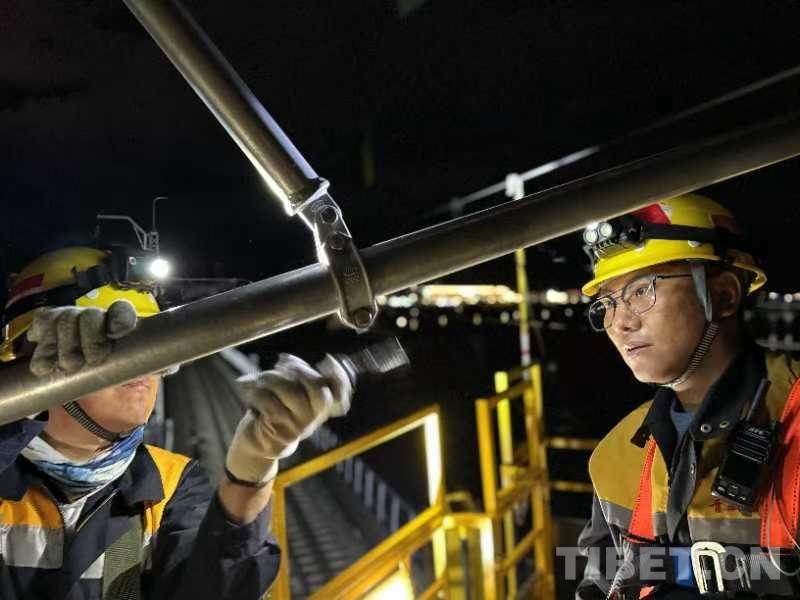 23時(shí)00分,軌道車穩(wěn)穩(wěn)???,“天窗”作業(yè)命令下達(dá)。中國鐵路青藏集團(tuán)有限公司拉薩基礎(chǔ)設(shè)施段供電維修技術(shù)中心拉薩南接觸網(wǎng)維修隊(duì)工長(zhǎng)李積王帶著7名工友走下接觸網(wǎng)作業(yè)車,驗(yàn)電、連接地線端、接掛地線……一系列操作一氣呵成。隨即,現(xiàn)場(chǎng)負(fù)責(zé)人拉加和工友們依次登上距離地面6米高的作業(yè)平臺(tái)上,穿梭于接觸網(wǎng)線索之間,猶如凌空“舞者”。