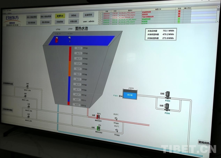 圖為運(yùn)行控制系統(tǒng)上可實(shí)時(shí)檢測(cè)蓄熱水池中各部分的水溫,平均溫度可達(dá)到60℃左右 攝影:王佳豪